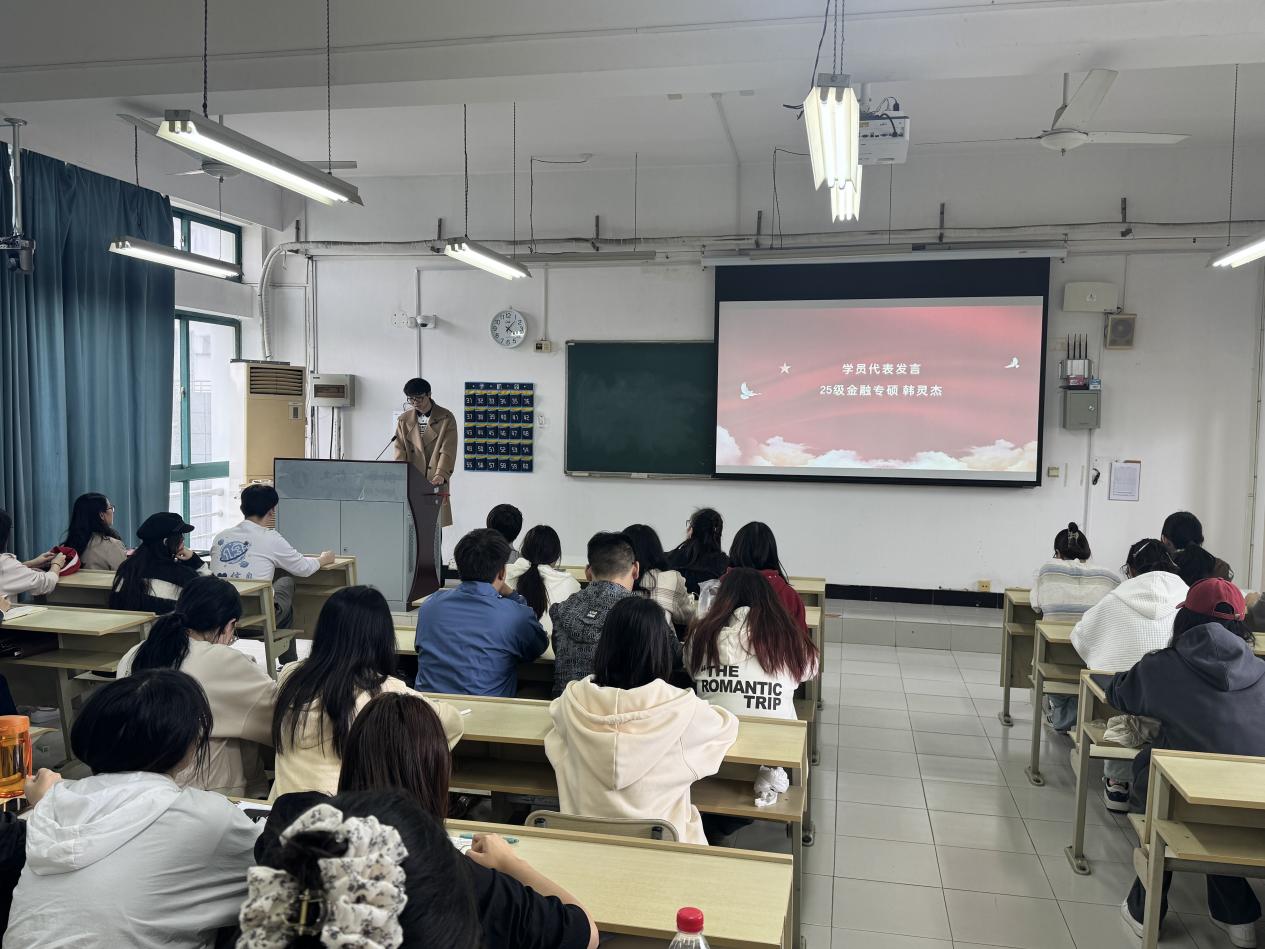 最后,入党积极分子代表2025级金融专硕班韩灵杰发言。他以“初心、践行、未来”为主题分享了自己对党的认识与向往,表达了参加培训的激动心情,他代表全体学员郑重承诺将在培训中认真学习,深入领会党的精神,不断提升自身思想觉悟,以实际行动争取早日成为一名合格的共产党员。