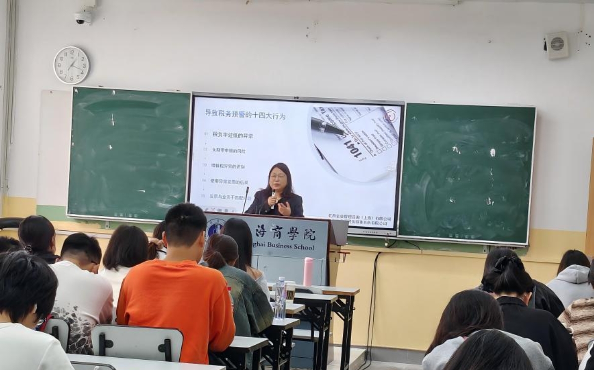 为深入贯彻落实本科教育教学审核评估要求,进一步推进产教融合,2025年10月30日商务经济学院邀请亿焘企业管理咨询和亿涵税务师事务所的创始人梁荷花、海账房商务咨询(上海)有限公司总经理杨依霞和张梅三位行业专家走进《税务管理实务》课堂,为师生讲授“税务稽查vs合规的实战策略”,分享实务工作中的涉税管理经验。