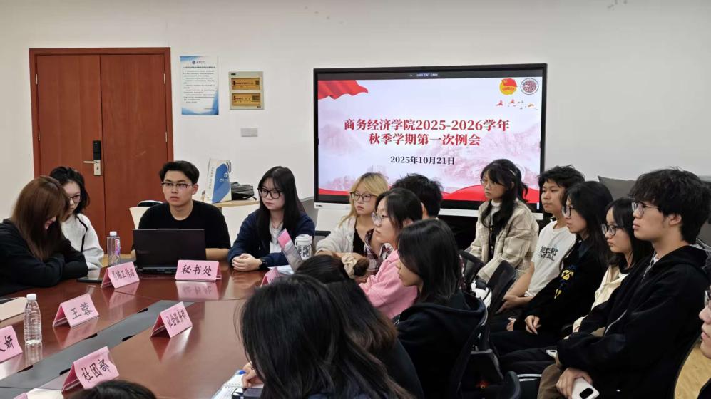 为规划新学年工作蓝图,凝聚团学骨干力量,商务经济学院第十一届团委学生会于10月21日15:30在综合楼201召开第一次团学例会。出席本次例会的有团委书记邵子轩,团委学生副书记冯皓玮、学生会执行主席余文妍、轮值主席王蓉、主席团成员唐宁以及全体团学干部。